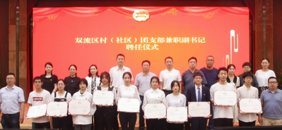 5月26日下午,双流区村(社区)团支部副书记聘任仪式在我校航空港校区国际会议厅举行。学校党委副书记马洪江,双流区东升街道党工委书记刘伟、黄甲街道党工委书记尹宏波,双流区东升街道、黄甲街道团工委以及学校党委组织部、宣传部、学生工作部、校团委相关负责人参加了聘任仪式。聘任仪式由校团委书记丁恒康主持。