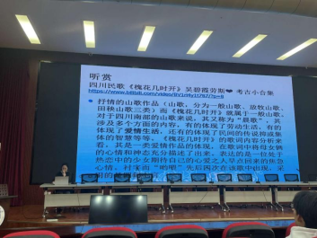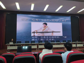 曾老师为同学们播放了古典音乐演唱家哈辉的《诗经·郑风子衿》和四川民歌《槐花几时开》,心灵放歌,回环往复,低吟浅唱,琴瑟和鸣,传达出从古至今一脉相承、至真至纯的情感,给同学们带来了听觉盛宴和美的享受,让他们感受到了民歌的艺术魅力。