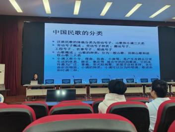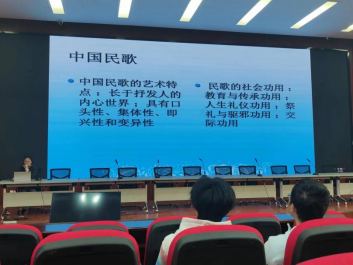 曾老师还为同学们介绍了民歌的艺术特点及社会功用。她重点讲解了民歌长于抒发内心世界的特点,及其深远的教育功能和重要的传承意义。开阔了同学们的视野,提高了审美情趣,使同学们受益匪浅。